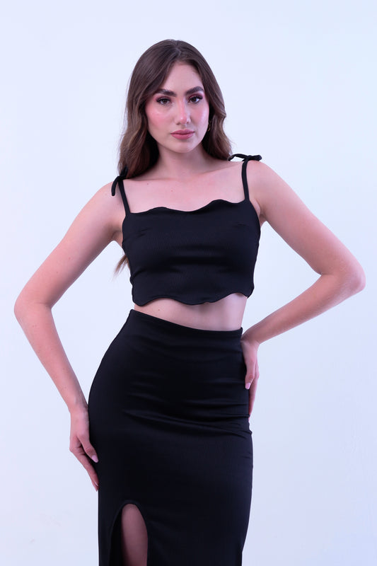 La falda de corte midi entalla la figura y presenta una abertura lateral que estiliza la pierna, con bordes ondulados que siguen la estética del top. Una propuesta delicada y segura, ideal para looks románticos pero con carácter.BlancoNegro -