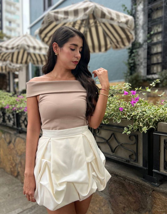 Precio habitual $130.000,00Precio habitualPrecio unitario / porPrecio de oferta $130.000,00La falda globo Kiss es una prenda moderna y estructurada, confeccionada en un tejido diagonal rígido que minimiza las arrugas y mantiene su forma impecable. Su diseño destaca por costuras elaboradas a mano, añadiendo un detalle artesanal y único que realza su estilo. Con una cintura ceñida que resalta la silueta y un corte corto, esta falda es ideal para un look sofisticado y vanguardista.