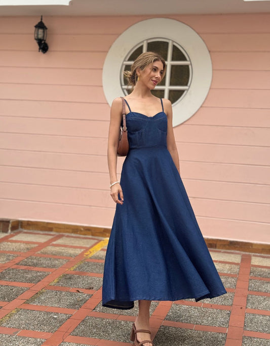 Precio habitual $200.000,00Precio habitualPrecio unitario / por$0,00Precio de oferta $200.000,00El vestido Denim es una prenda elegante y moderna, confeccionada en chambray, un tejido ligero y fresco. Su diseño destaca por una apariencia de corset en la parte del busto, realzando la silueta de manera sofisticada. Presenta líneas en la cintura con costuras en contraste, añadiendo un toque estructurado y estilizado. Cuenta con tiras brindando soporte y comodidad. En la parte trasera, incorpora un cierre para un ajuste perfecto. Ceñido hasta la cintura, y corte tipo A hasta el tobillo, creando un efecto fluido y favorecedor