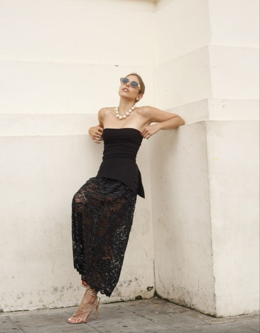 Precio habitual $120.000,00Precio habitualPrecio unitario / por$0,00Precio de oferta $120.000,00La Falda Luz es una pieza elegante y versátil, elaborada en delicada blonda, con visos plateados que aportan un brillo sutil y sofisticado. Su diseño incluye un forro aparte hasta media pierna, permitiendo un juego de transparencias ideal para un look fresco y moderno. Con cintura encauchada para un ajuste cómodo, su corte midi y el detalle de zócalo en el dobladillo la convierten en la opción perfecta para una vibra playera o un estilo más chic y relajado.
