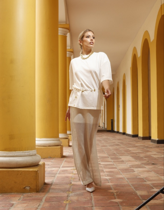 Precio habitual $120.000,00Precio habitualPrecio unitario / por$0,00Precio de oferta $120.000,00La Falda Luz es una pieza elegante y versátil, elaborada en delicada blonda, con visos plateados que aportan un brillo sutil y sofisticado. Su diseño incluye un forro aparte hasta media pierna, permitiendo un juego de transparencias ideal para un look fresco y moderno. Con cintura encauchada para un ajuste cómodo, su corte midi y el detalle de zócalo en el dobladillo la convierten en la opción perfecta para una vibra playera o un estilo más chic y relajado.